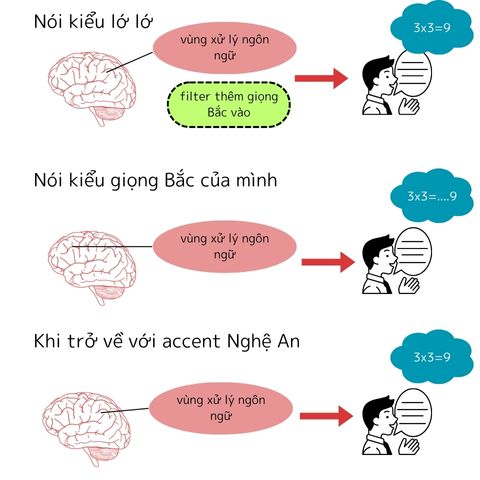 Về cơ bản mình thấy có một kiểu nói giọng miền Bắc của một số người khu vực NA-HT, là vẫn nói phát âm theo kiểu miền Trung, nhưng theo kiểu “lớ lớ”. Mình nghĩ khi đó thì vùng xử lý ngôn ngữ trong não họ vẫn dựa vào những output của não đưa ra, nhưng chỉ thêm một lớp filter giọng Bắc vào nên nó mới nghe như vậy. Đổi lại thì lại họ có thể nói khá là tự nhiên.